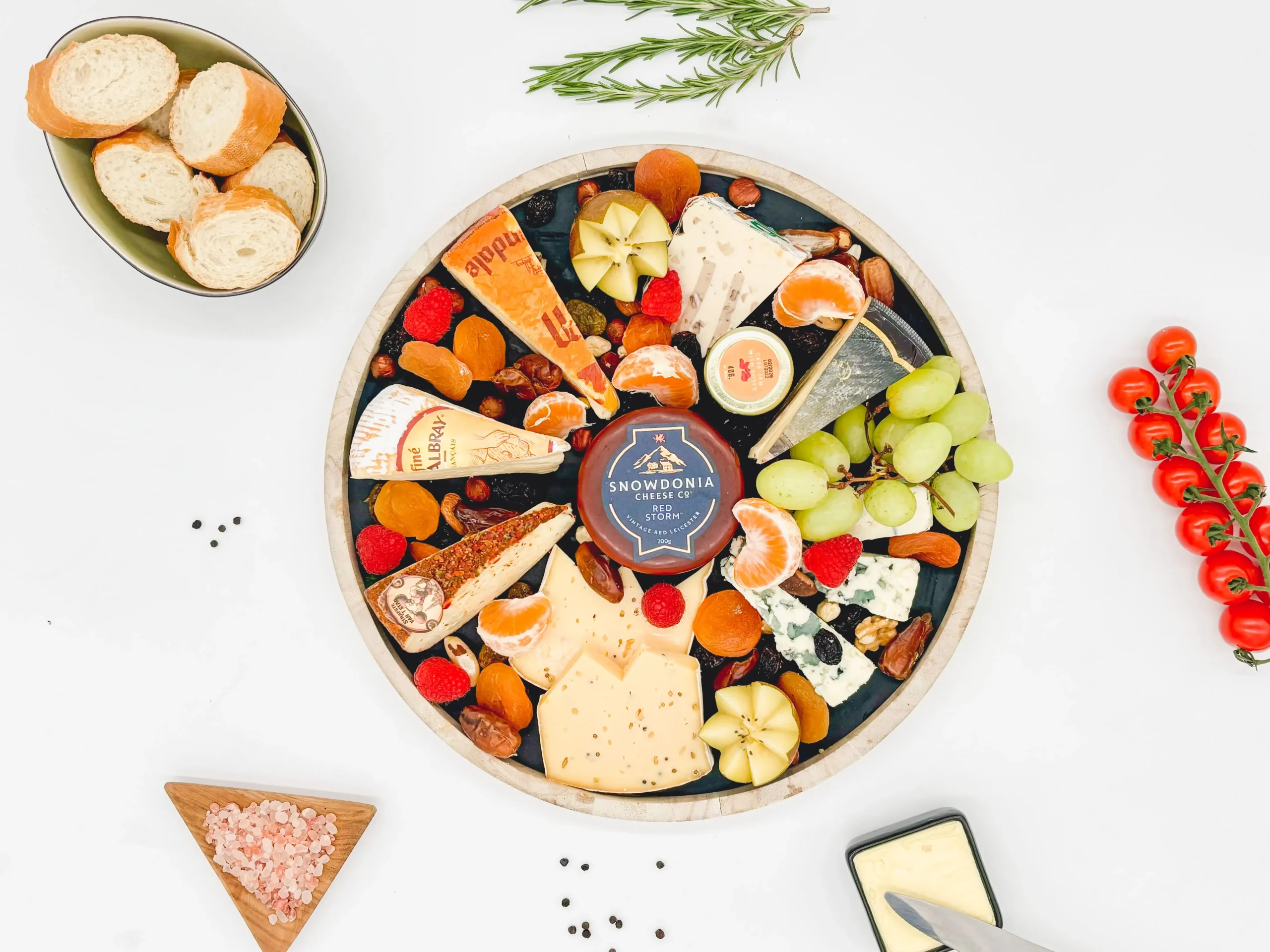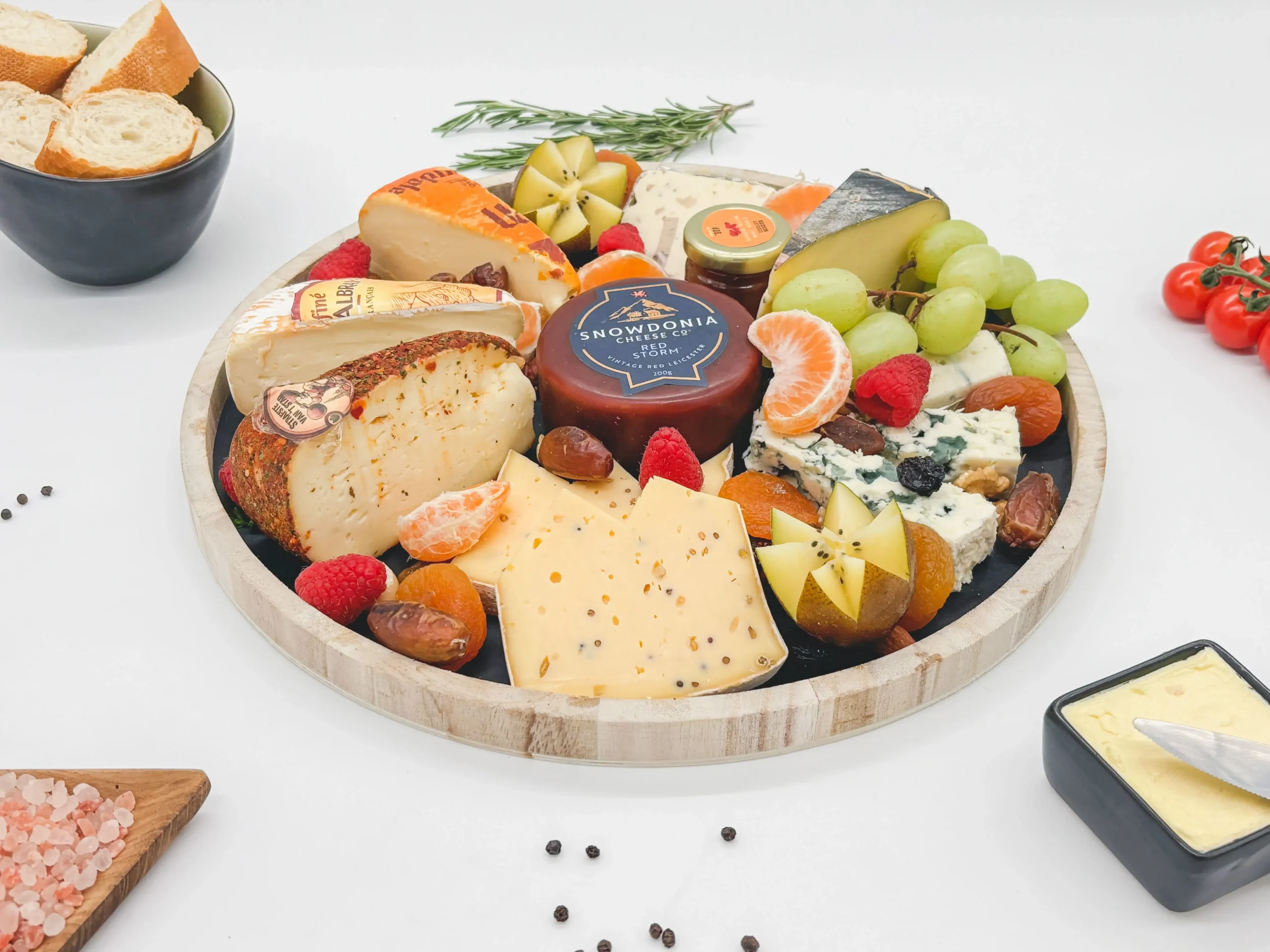 Assortiment van kazen met vers fruit, noten, gedroogde vruchten en confituurtjes.