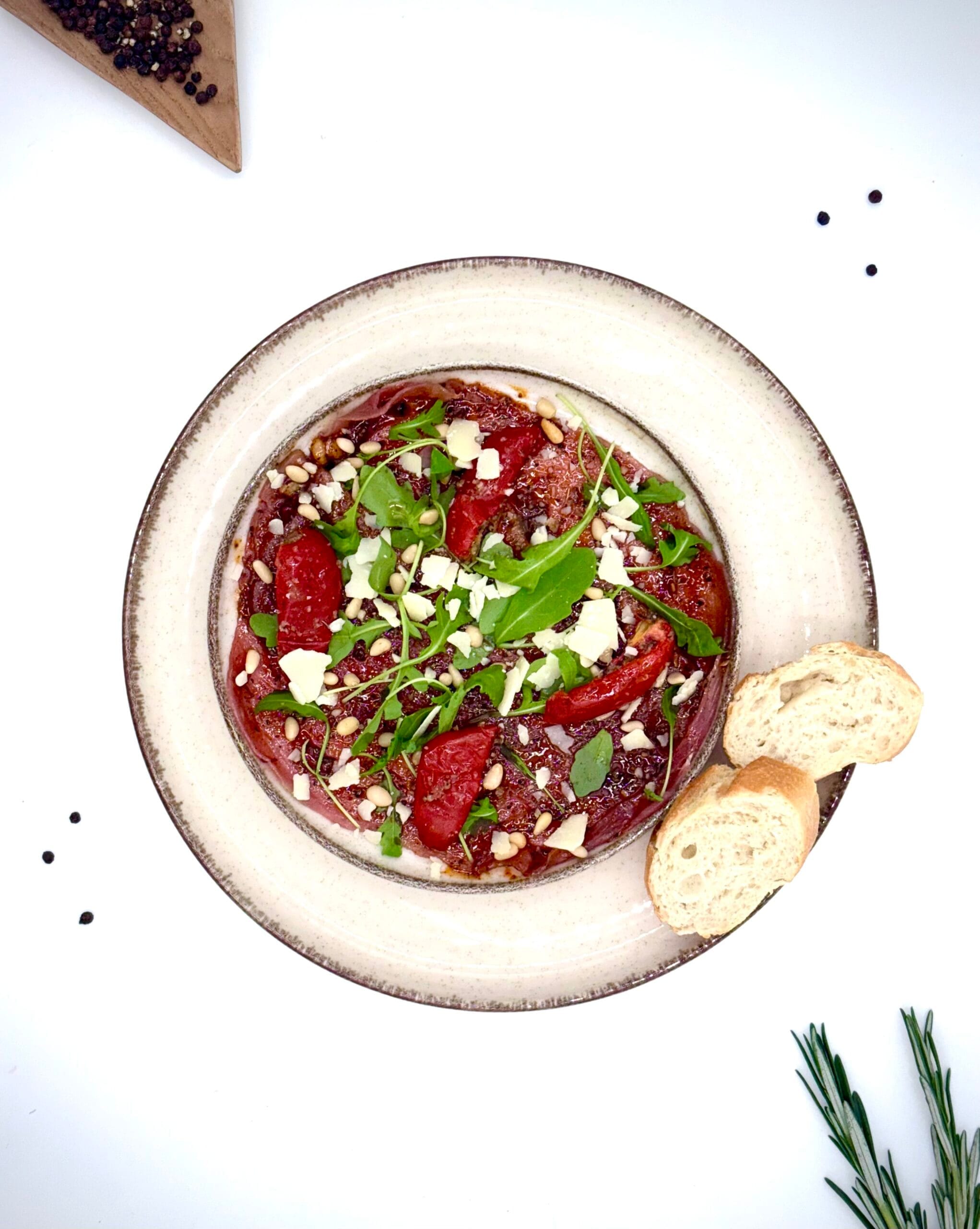 Verse rundscarpaccio met rode pesto dressing, pijnboompitjes, parmezaan zongedroogde tomaten en rucola.